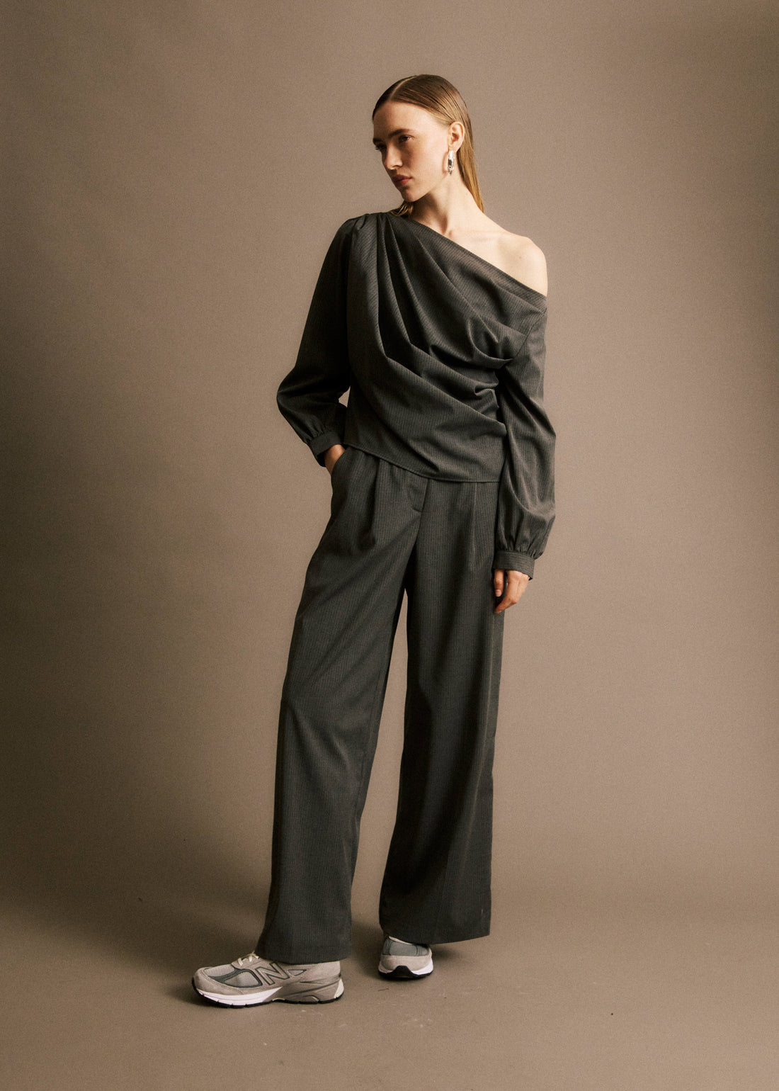 • Top asymétrique rayé gris• Détails de pinces et plis• Col asymétrique