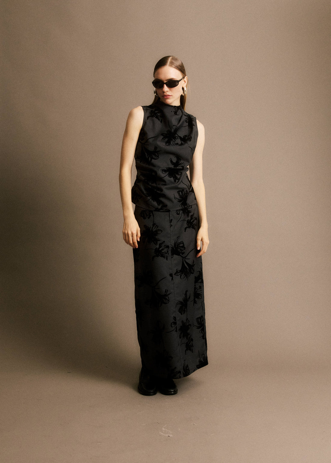 • Top plissé sans manches gris• Motifs fleurs floquées en velours noir• Coupe près du...