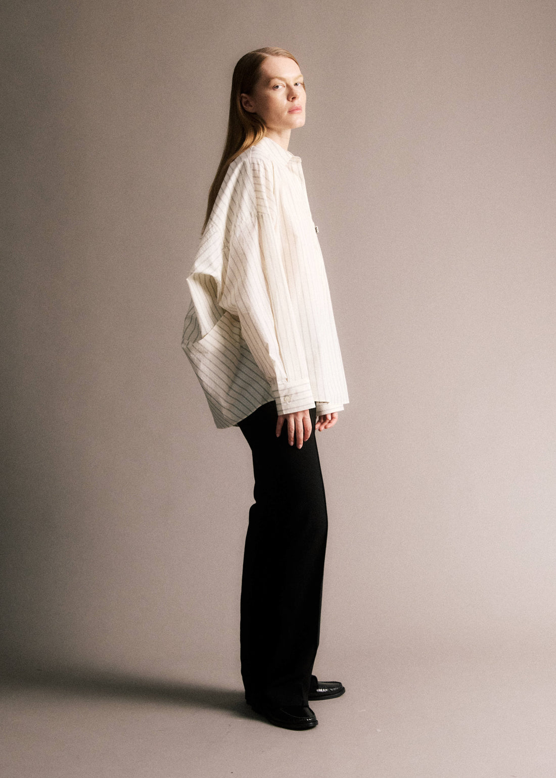• Top asymétrique rayé gris• Détails de pinces et plis• Col asymétrique