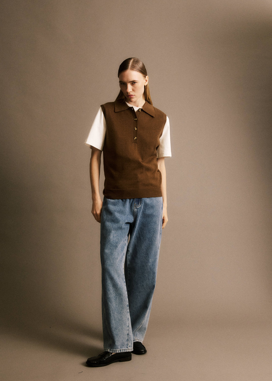• Pull style polo sans manches chocolat• Col chemise et boutons• Pull sans manches en...