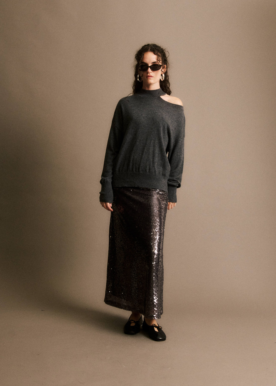 • Pull asymétrique gris• Découpe sur l'épaule• Col montant• Pull en laine