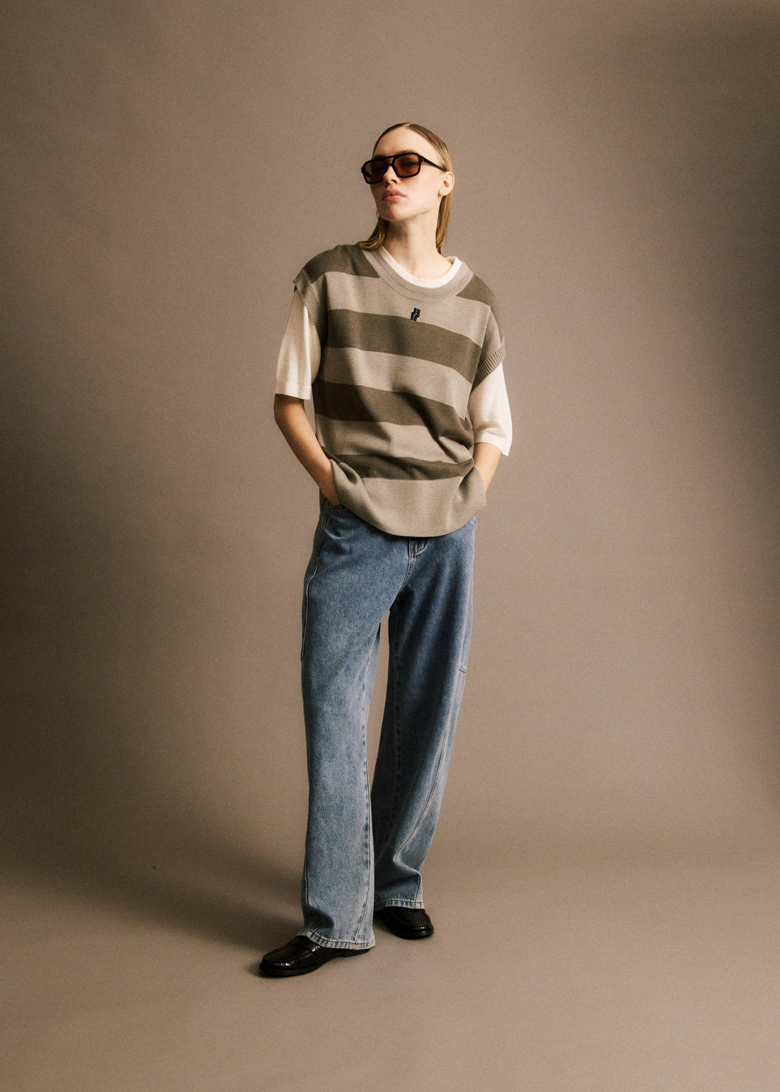 • Pull manches courtes en laine rayé• Déclinaison de marron glacé• Pull en laine• Coupe...