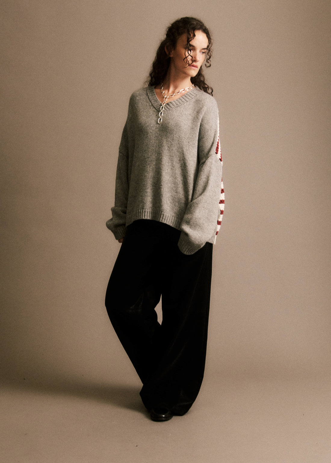 • Pull en laine gris• Manches longues et col v• Dos contrasté à rayures• Coupe...