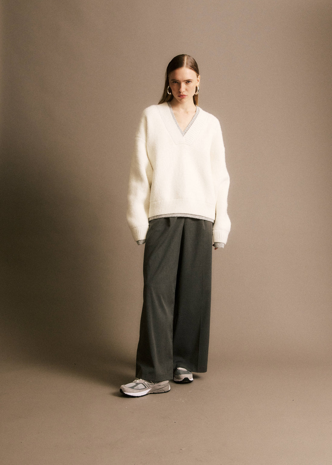 • Pull en laine col v blanc• Manches longues• Finitions bords-cotes