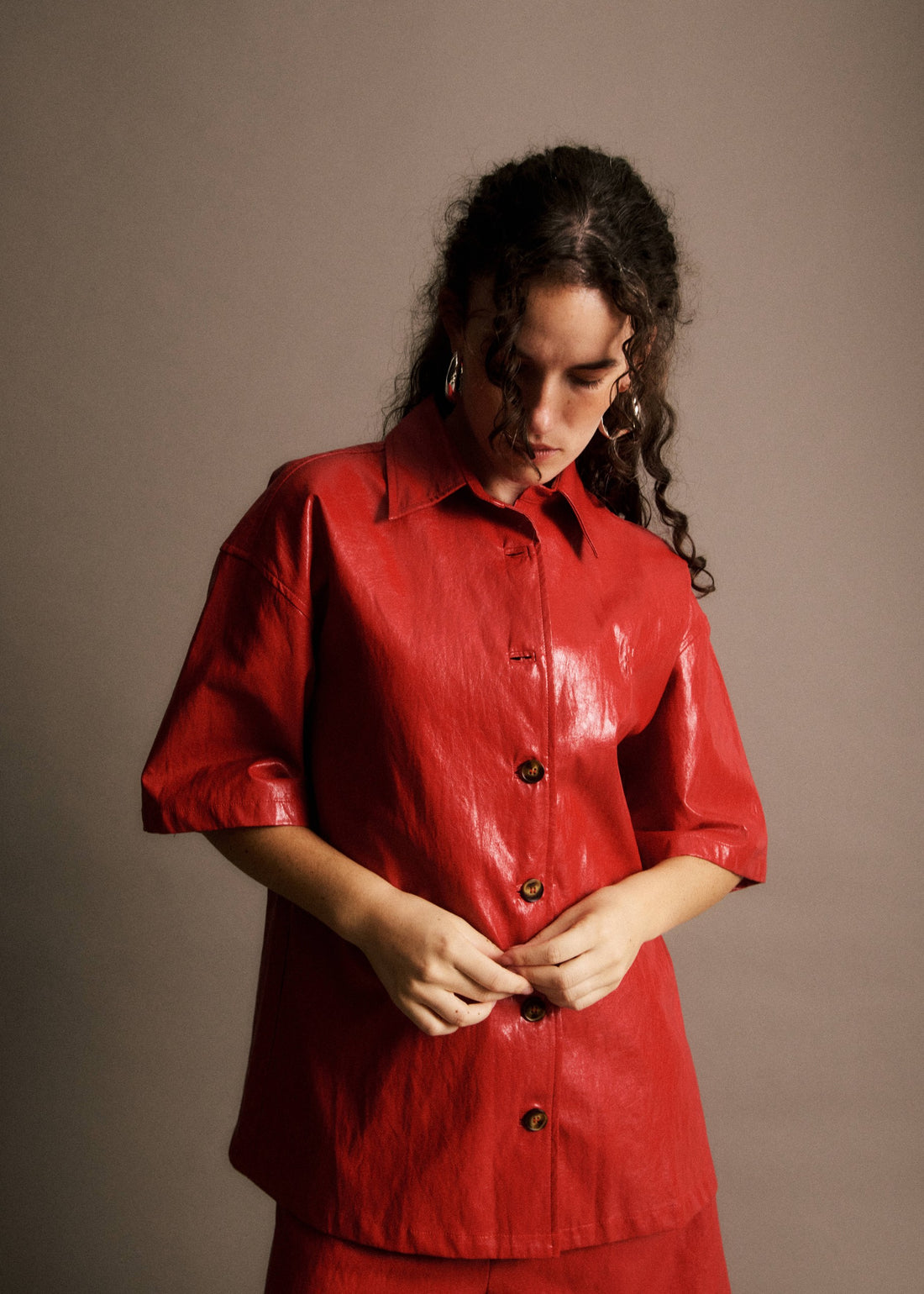 Chemise à manches courtes en simili cuir texturé avec col classique et fermeture boutonnée. •...