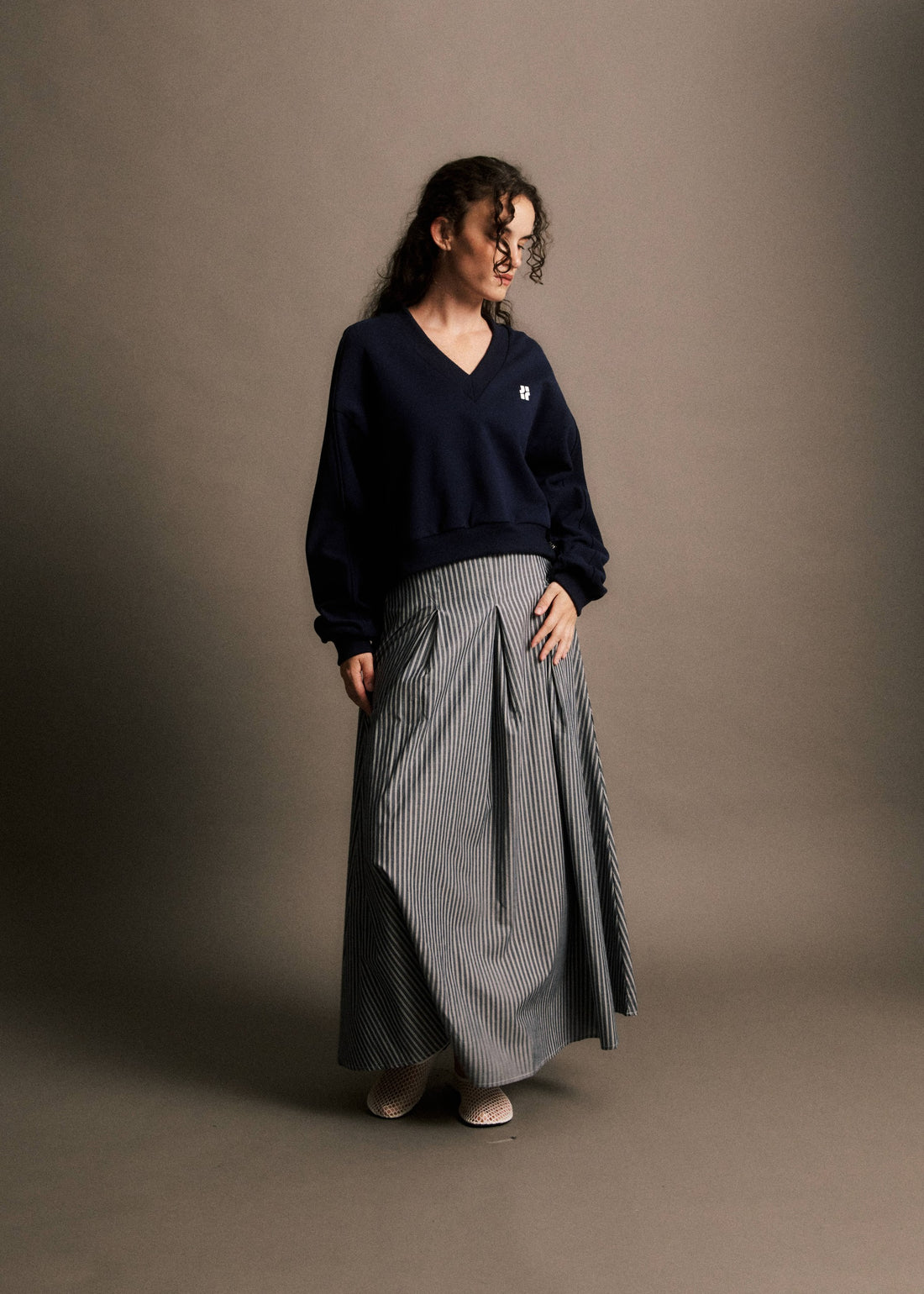 • Jupe longue plissée coupe évasée• Rayures verticales contrastées sur toute la surface• Taille haute...