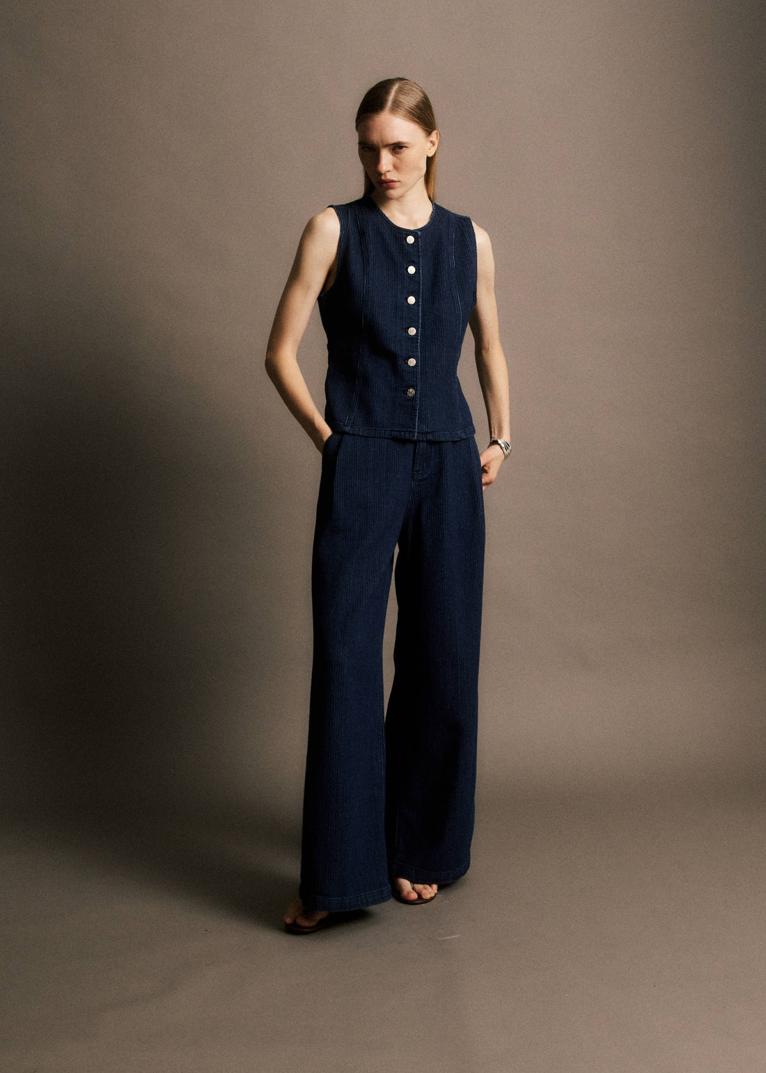 • Jean coupe large et fluide• Taille haute avec ceinture élastiquée• Haut sans manches avec...