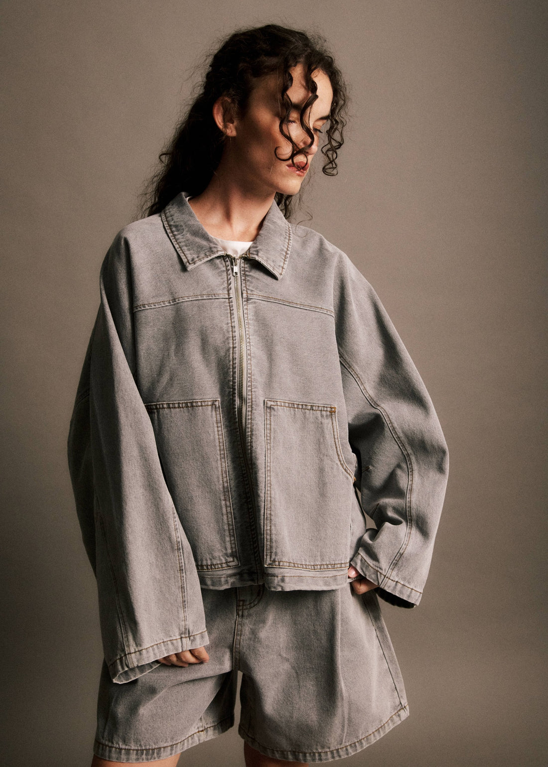 • Loose and relaxed fit denim jacket• Classic shirt collar and long sleeves• Central metallic...