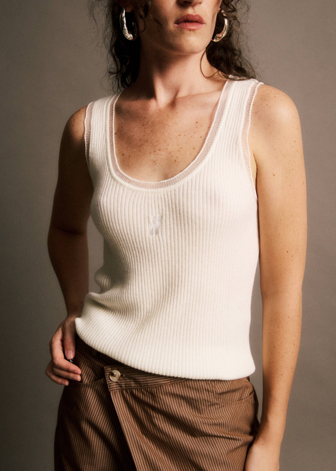 • Sleeveless, fitted tank top• Generous scoop neckline• Fine textured ribbed knit• Ribbed trim at...