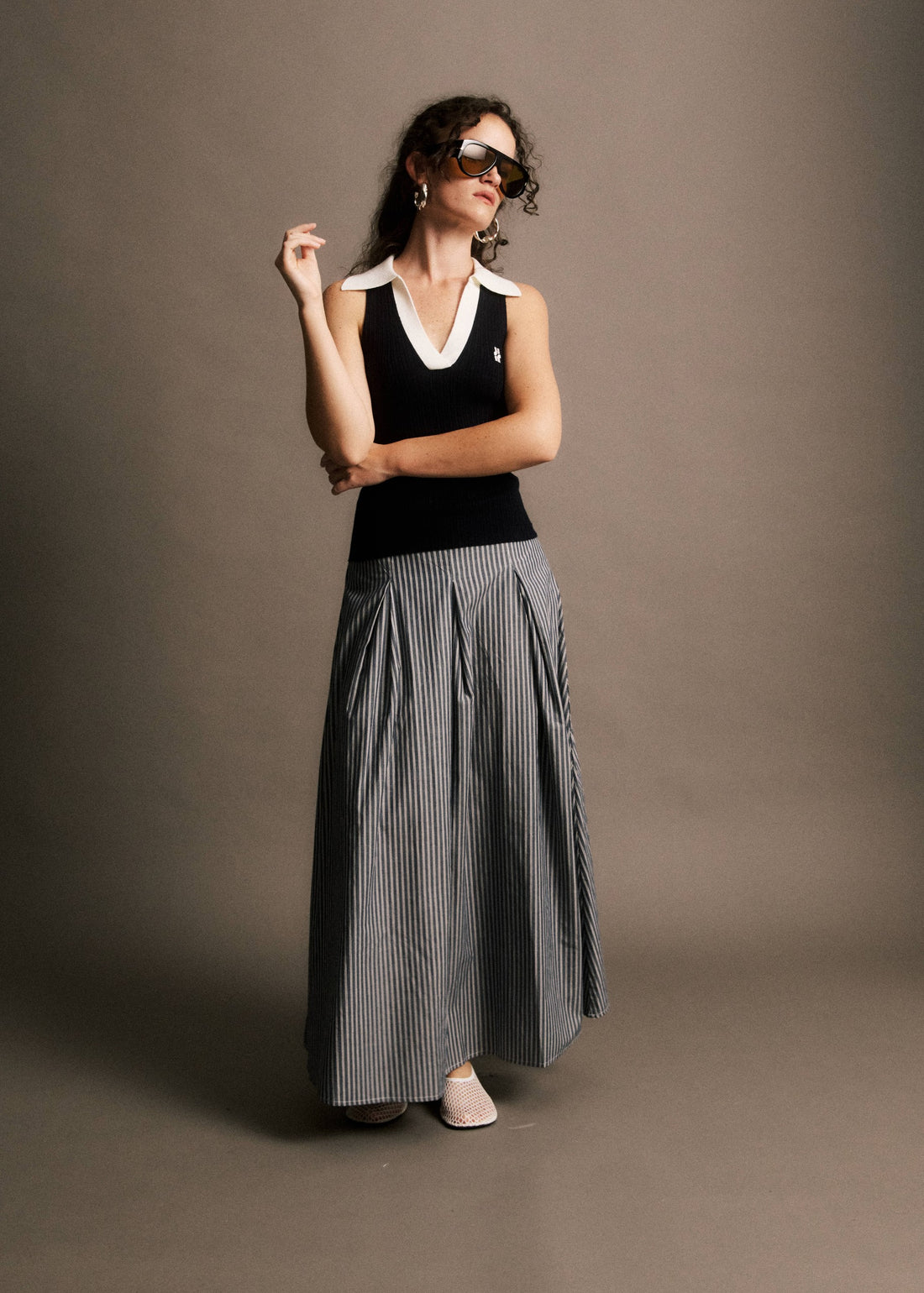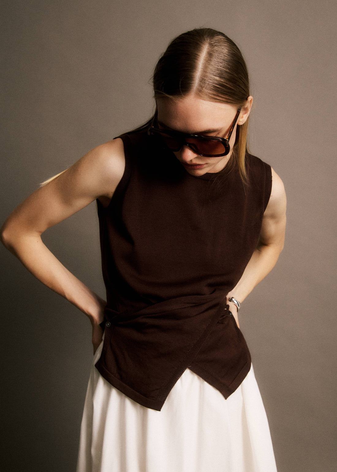 • Sleeveless cut with clean lines• Round neckline close to the neck for a minimalist...