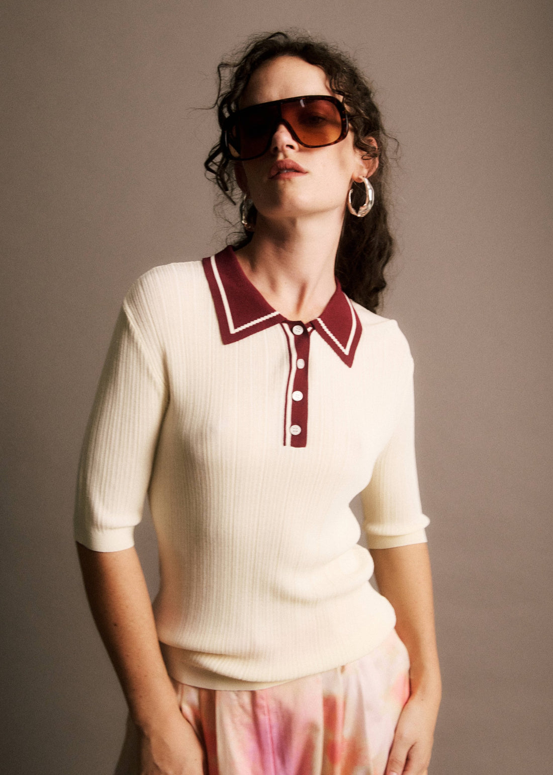 • Fitted ribbed knit polo shirt• Contrasting polo collar and button placket• Short ribbed sleeves•...